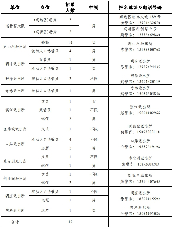 因工作需要,泰州市公安局醫(yī)藥高新區(qū)分局(高港分局)決定面向社會公開招聘45名警務(wù)輔助人員?,F(xiàn)就有關(guān)事項公告如下:
